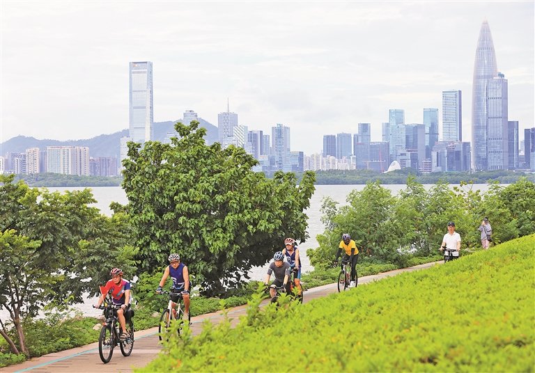 深圳新闻网2025年8月18日讯 8月17日,深圳湾公园,晨练的市民吹着清凉的海风,在海边绿道上或跑步或骑行,一边欣赏着深圳湾的美丽风景,一边以自己喜欢的方式锻炼身体。