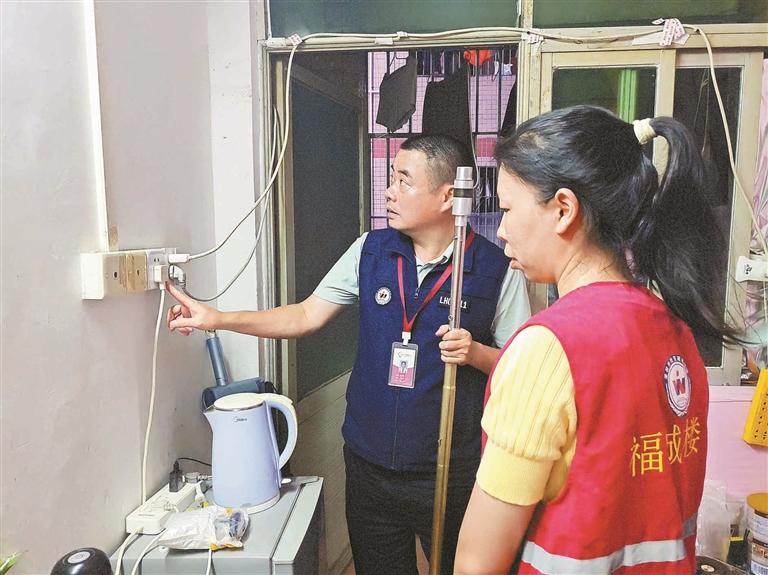 ▲网格员联合楼长排查安全隐患。