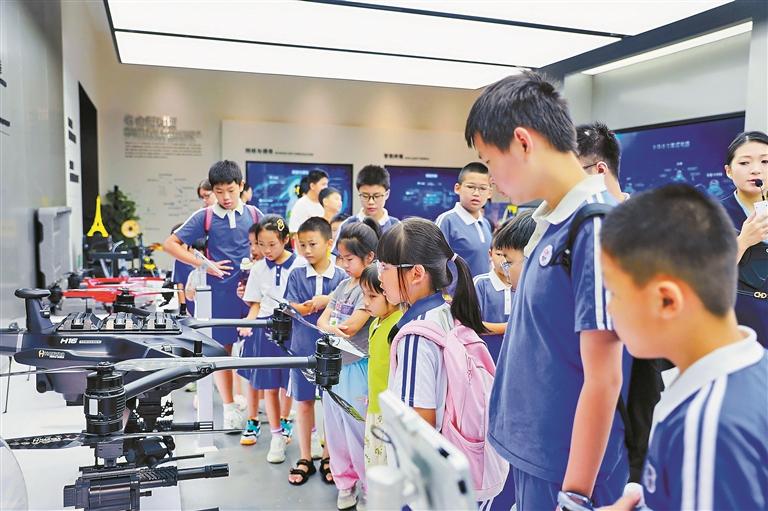 孩子们在龙华未来城市展览馆参观无人机产品。