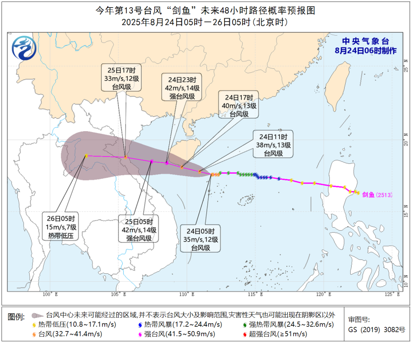 大风预报:8月24日08时至25日08时,南海大部、西沙群岛和中沙群岛附近海域、北部湾、琼州海峡、海南岛及沿海、广西沿海、广东中西部沿海将有6-8级大风,其中南海西北部和中西部及西沙群岛部分海域、北部湾中部和南部海域、海南岛沿海的风力有9-11级,“剑鱼”中心经过的附近海域或地区的风力可达12-14级、阵风15-16级。