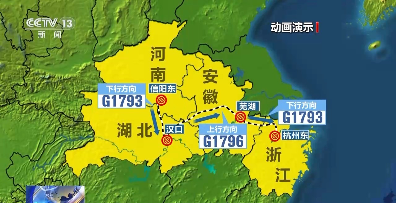 以由信阳东开往杭州东的G1793次列车为例,列车从信阳东站始发时车次为G1793次,途中汉口站和芜湖站都是交会站,列车分别转为上行和下行,因此自汉口站起,车次变更为G1796次,自芜湖站起变更为G1793次,共经过2次变化。