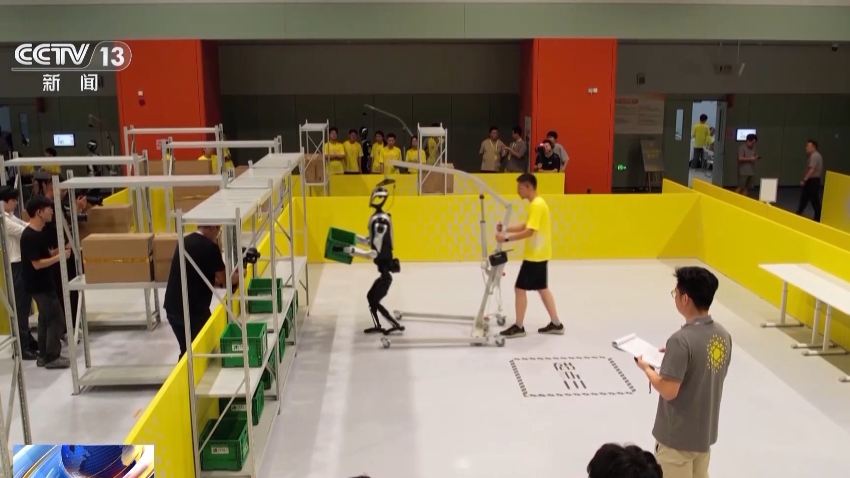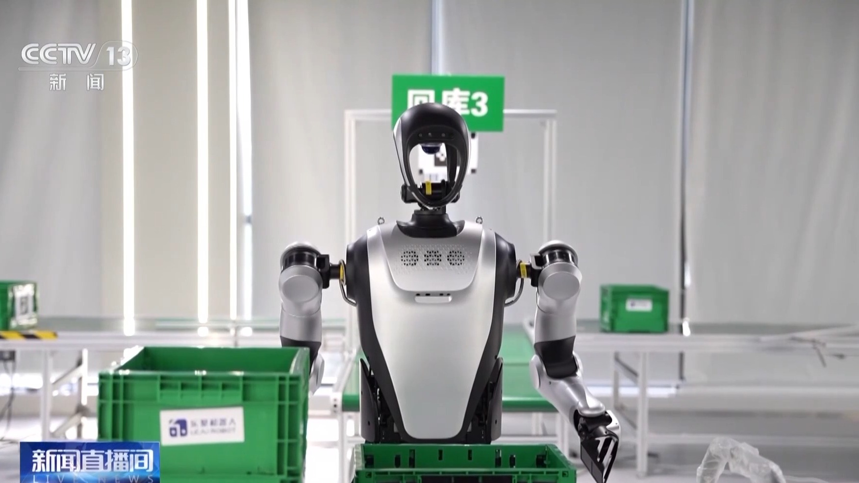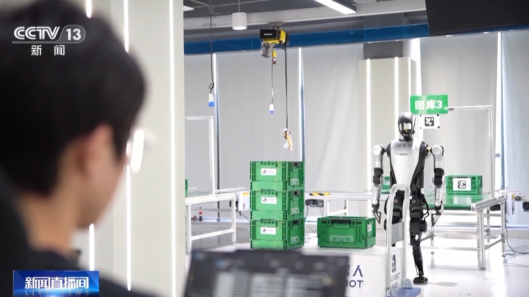 总台央视记者 古峻岭:我们看到它在搬箱子的时候动作还是非常流畅的,其实这么一个简单的一抓一取之间也是有门道的,他得精准计算箱子的大小和重量,里边儿有没有货物,用多大的力量,既不要把箱子夹碎,又能够正好把他抬起来。我们可以看到这款机器人一次工作的时长可以达到两三个小时,而且在工作过程中无需停止即可完成电池更换。