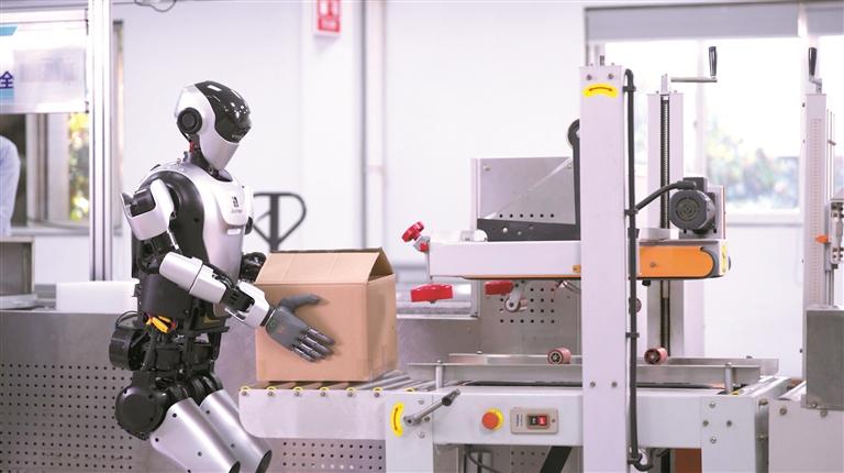 乐聚“夸父”人形机器人在工业场景中进行封箱工作。