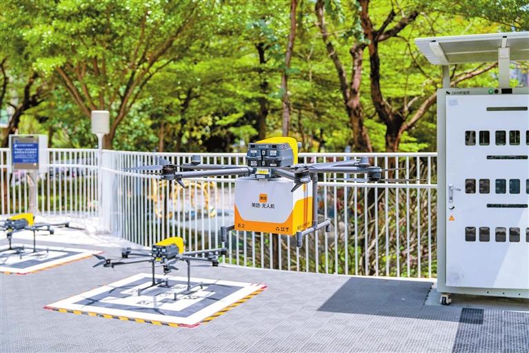 美团无人机带着外卖从起降点起飞。