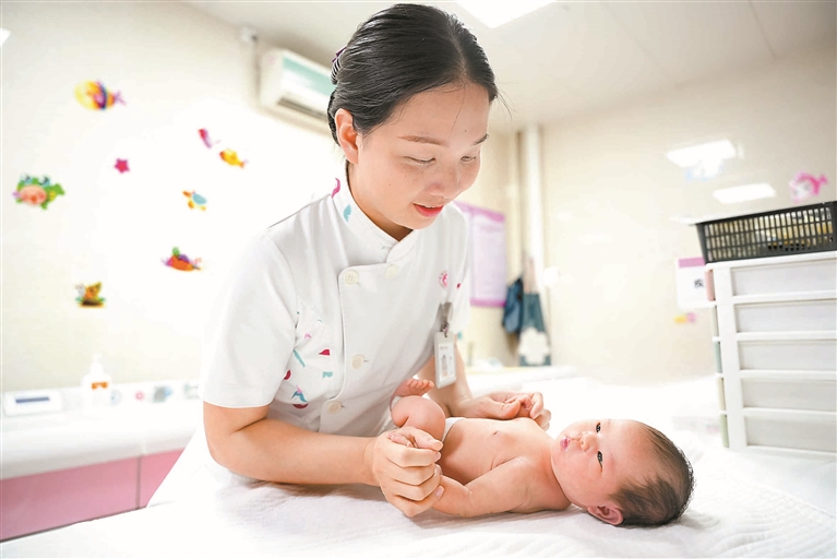 在龙华区妇幼保健院,产一科护士李昭君正温柔地为新生儿抚触。