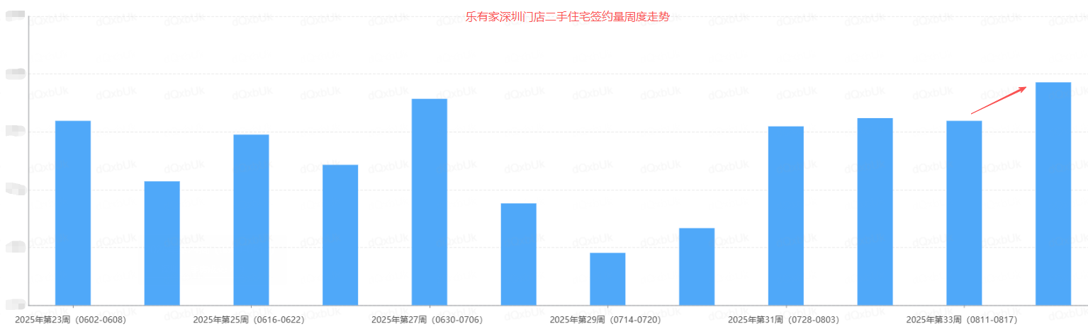 乐有家研究中心数据显示,上周深圳门店二手住宅看房量环比持平,连续3周维持相对高位,门店二手住宅签约量环比上涨5.8%,且保持持续稳定态势。值得注意的是,上周深圳1500万以上高端改善房源成交占比大幅提升,占比5.6%,上涨3.1个百分点,达到7月以来的新高。股市冲新高,部分在股市获益的高端客户开始将所获收益投入楼市,带动楼市活跃度同步提升,金九银十可期!