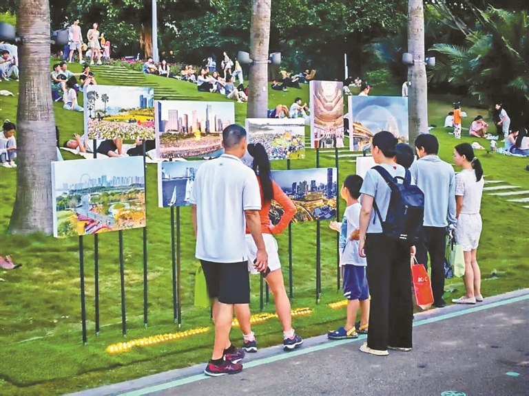 公园绿道为路引,图景交织为底色,这是本次展览的重要亮点。前海石公园,毗邻前海湾,作为改革开放精神的重要象征,该公园以“前海石”为核心,与一顷碧波之上的欢乐海湾“湾区之光”摩天轮隔海相望,是自然生态与城市活力完美融合。记者在现场看到,展览图片静伫公园内海滨栈道、椰林草坪、观景平台之中,引入无人咖啡机和拍照打印机等互动装置,增强观展体验。部分图片针对拍摄内容场景,进行实景安放,市民可身临其中,追随镜头下前海的一帧帧记忆,直观实景中前海的一幅幅画卷。