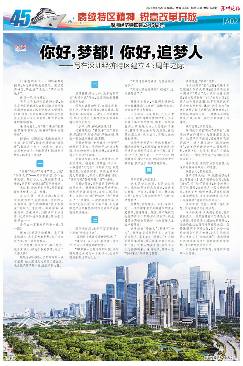 今天的深圳,肩头担子更重,前方挑战更大。但那股源自千万普通人内心深处、渴望改变与超越的梦想热力,奔涌得比以往任何时候都更热烈。在特区45周年华诞之际,我们向每一位为梦想奋斗的人致敬,是你们用滚烫的人生定义了“梦想之城”。未来深圳何以续写新传奇?答案就在相信梦想、追逐梦想的你我手中。