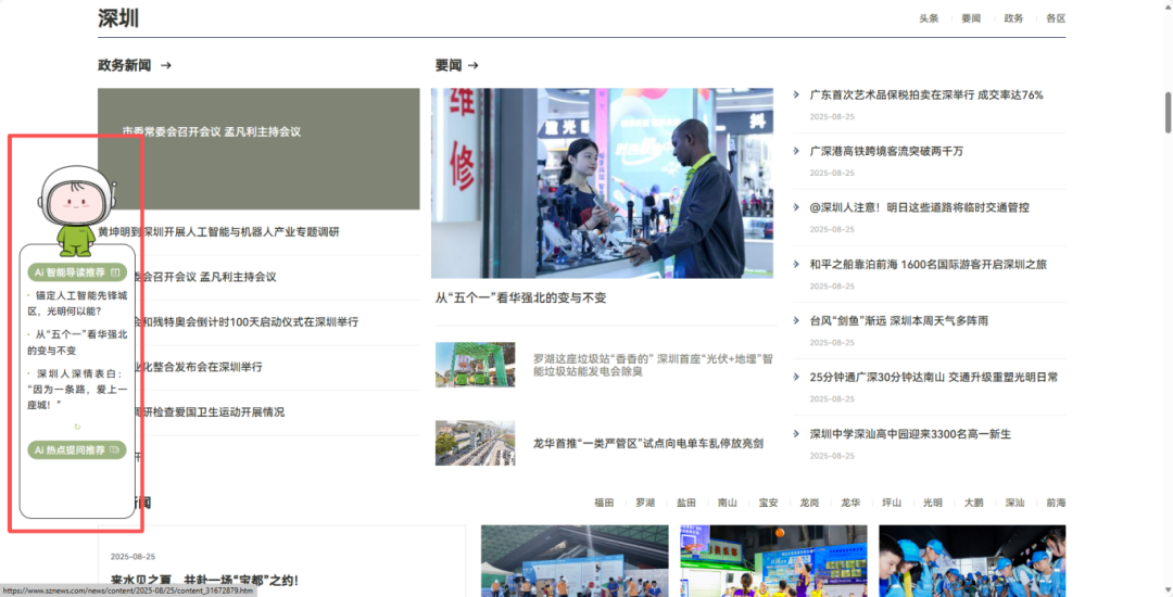 在民生服务场景中,AI生活文旅导航实现了“内容即服务”的突破,能够主动引导用户查询景区、商场等信息,如推荐热门景点、规划最佳路线、介绍网红餐厅等,使新闻成为了城市生活的“智能向导”。新增订阅功能与“千人千面”推荐系统,基于用户画像精准推送内容,让每位用户通过这张“数智深圳名片”快速触达深圳动态。