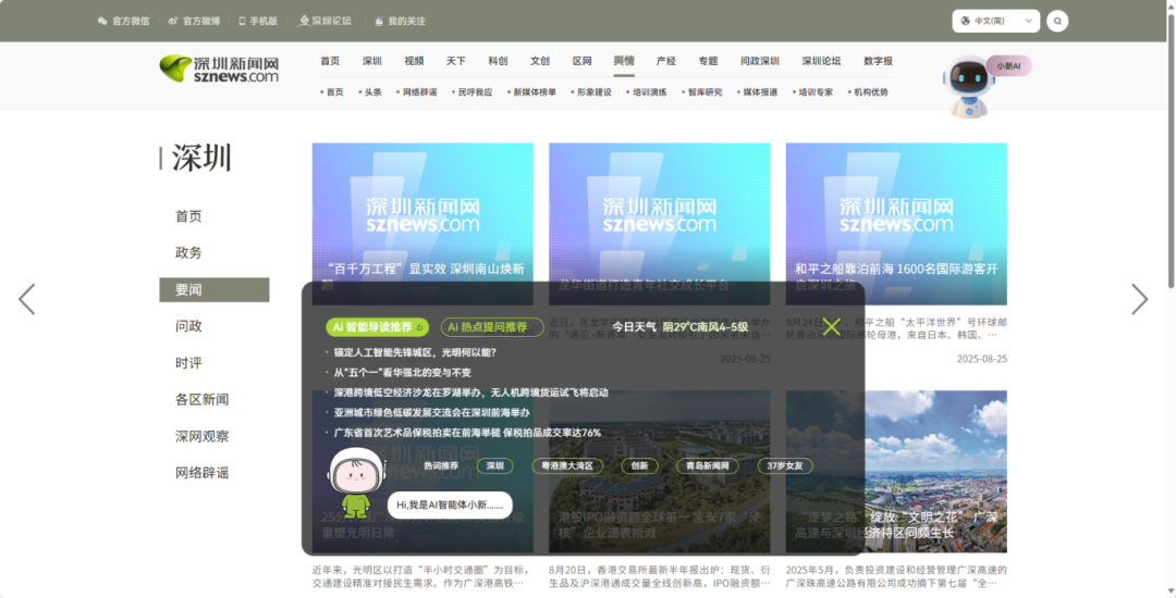 深圳新闻网相关负责人表示,未来将持续深化AI技术应用与生态构建,让这张“数智深圳名片”更精准、全面地向世界展示深圳的科创实力与城市魅力。