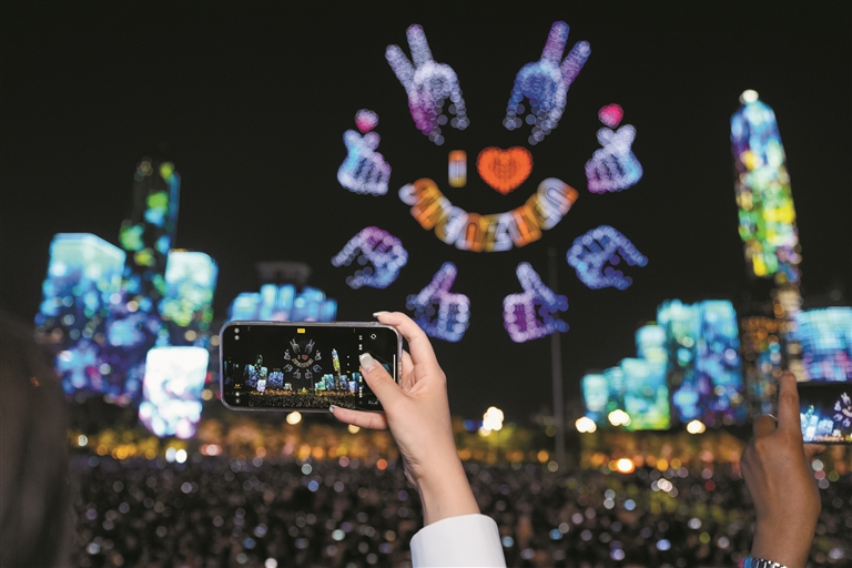 在深圳市民广场,精彩的无人机表演引得欢呼声不断。