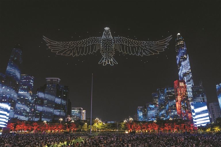 无人机编队组成“大鹏”展翅翱翔于深圳市民广场上空。