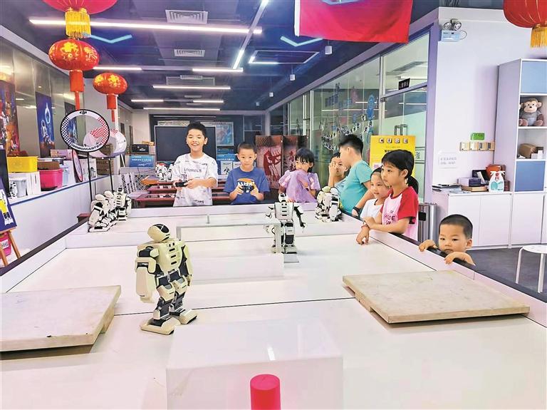 龙华新闻讯(记者 宋彪 通讯员 凌云/文 记者 陈建华/图)8月23日,观湖街道松轩社区工联会组织辖区20名职工子女走进锦绣科学园千越人工智能科普教育基地,开展“机器人科创体验日”活动。孩子们通过“看、玩、赛、思”四个环节,完成了一场别开生面的“未来之旅”。