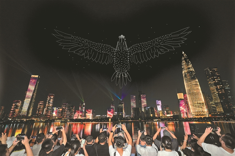 1.2万架无人机腾空而起,与城市灯光秀交相辉映,以天空为幕、以科技为笔,为市民游客献上一场科技与艺术共舞的视觉盛宴,向世界生动讲述深圳经济特区建立45年的发展奇迹。