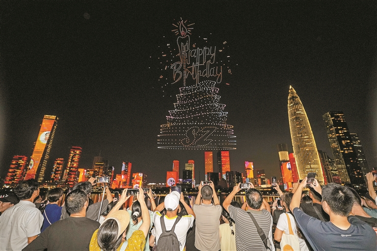 1.2万架无人机腾空而起,与城市灯光秀交相辉映,以天空为幕、以科技为笔,为市民游客献上了一场科技与艺术共舞的视觉盛宴,向世界生动讲述了深圳经济特区建立45年的发展奇迹。
