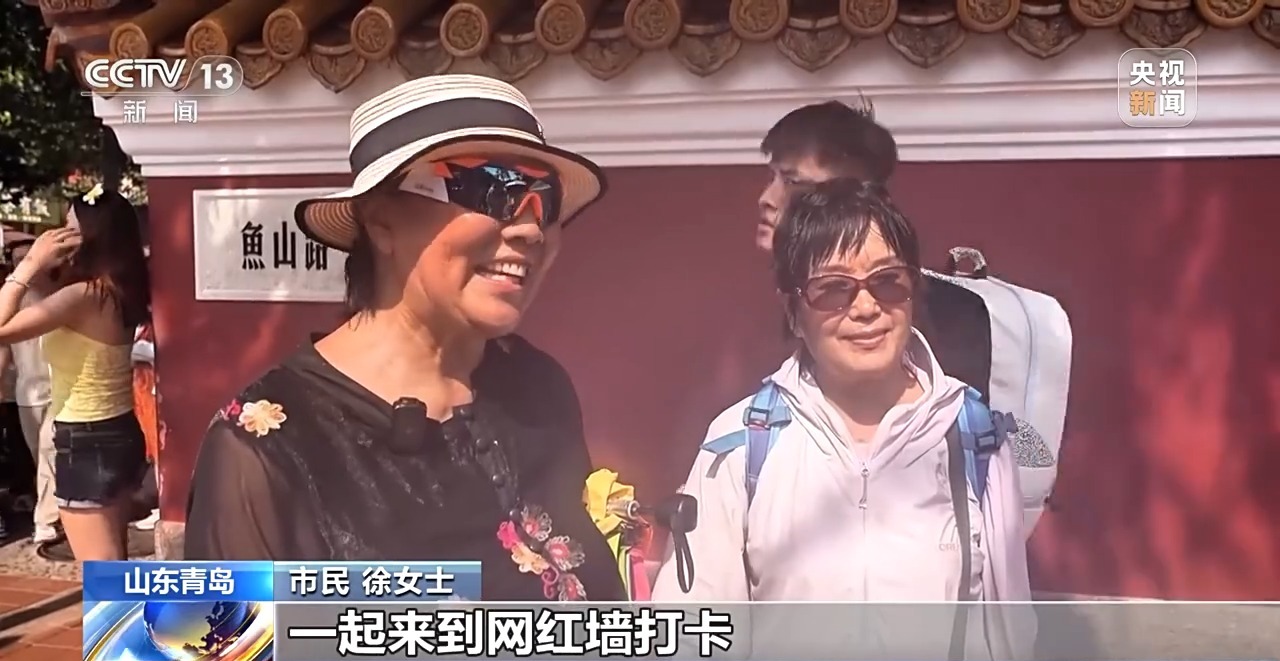 在青岛大学路“网红墙”前,慕名而来的游客络绎不绝,这里因其红墙黄瓦的复古建筑与标志性的“转角”设计,吸引不少人前来打卡拍照。