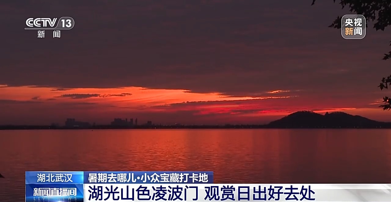 在湖北武汉,清晨的东湖,宁静柔美。而东湖凌波门则是这幅画卷的点睛之笔,当第一缕金光从磨山侧峰探出,霞光灿烂映在碧波上,仿佛湖面被撒下千万碎钻,让人屏息倾心。这样绝美的日出场景,让凌波门迅速成为年轻人争相打卡的“网红地”。