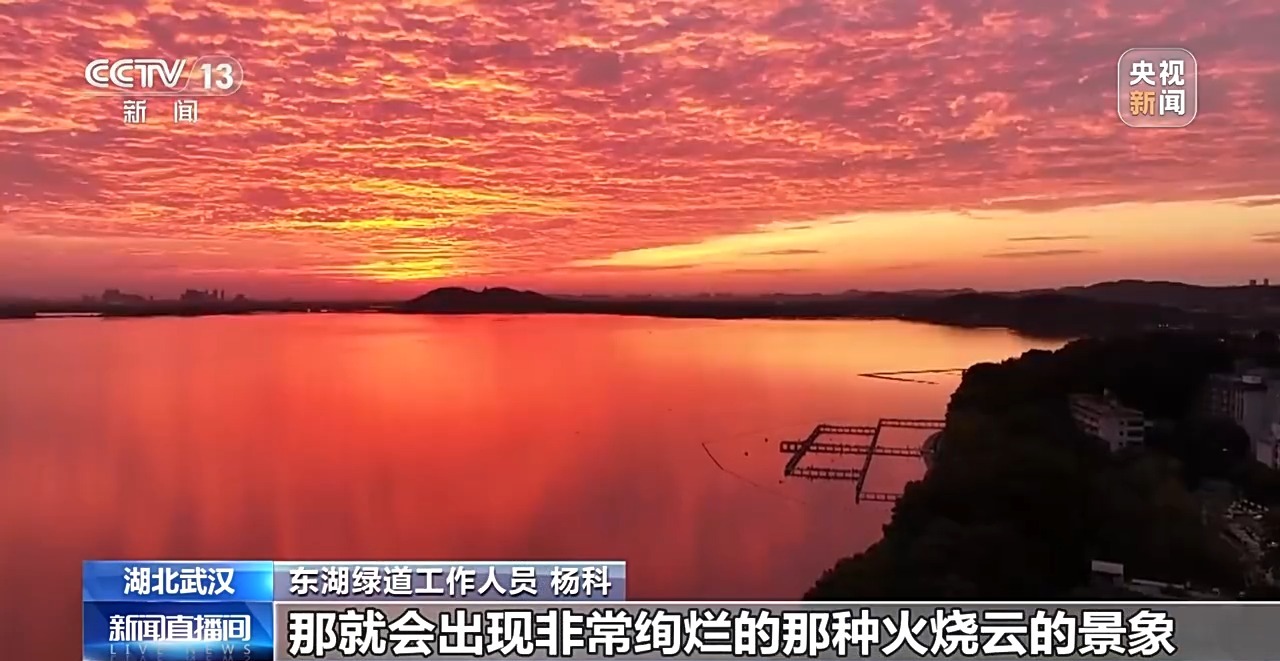 东湖绿道工作人员 杨科:这两天正好遇上多云,但是云层很薄的天气,那就会出现那种非常绚烂的火烧云景象。对于很多游客和摄影爱好者来说,他发朋友圈或者拍视频都可以是不用P的。