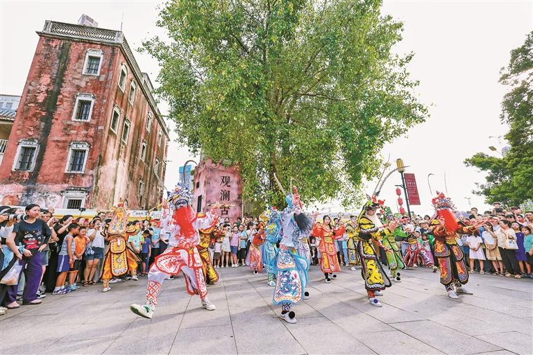 8月24日的观澜古墟主街区,人声鼎沸。随着一声“起鼓”的号子喊出,雄浑的潮州大锣鼓响起。烈日下,黑衣时迁手持银环灵蛇,轻巧地走在队伍的最前方;头槌、二槌紧跟其后,皂靴狠踏青石板,木槌在指尖飞转时交击的震颤之声混着吼声,激荡得古墟骑楼廊柱、碉楼青砖瓦黛仿佛簌簌回响……