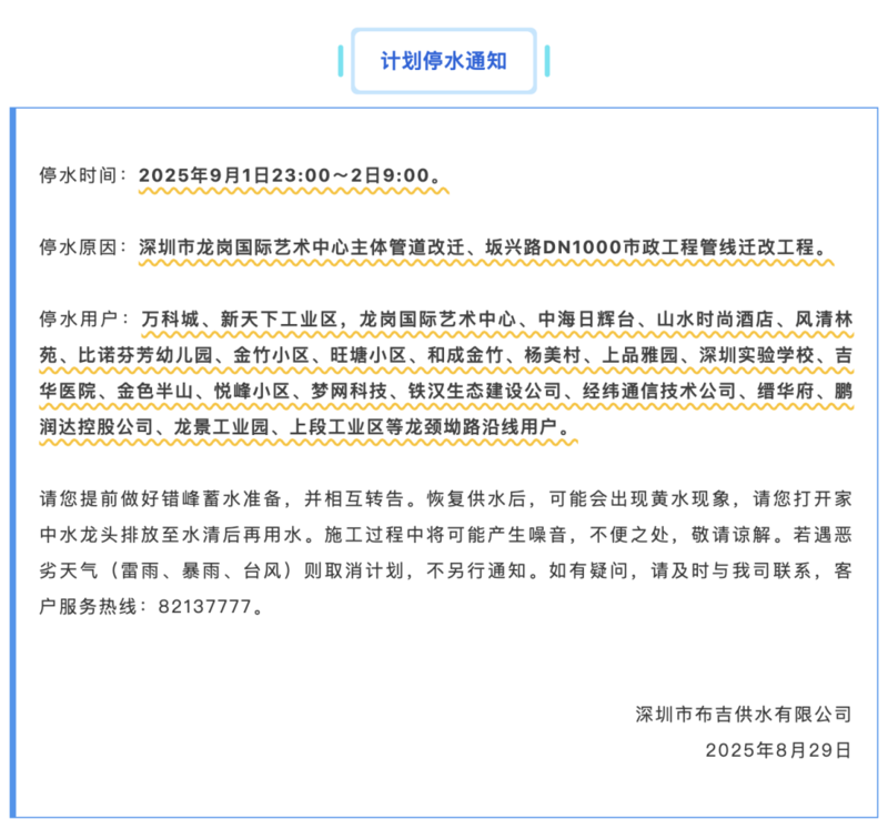 8月31日上午,深圳市布吉供水有限公司发布通知称,因受深圳市龙岗国际艺术中心主体管道改迁、坂兴路DN1000市政工程管线迁改工程施工影响,龙岗区部分用户将在2025年9月1日23:00至2日9:00期间停水。