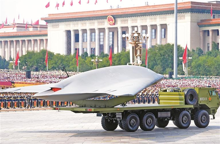 空中无人作战方队 方队新型察打一体无人机、无人僚机、舰载无人直升机等装备,可隐蔽出击、广域覆盖、自主协同,创新未来空战新样式。