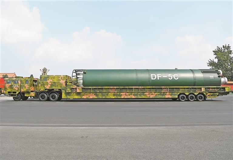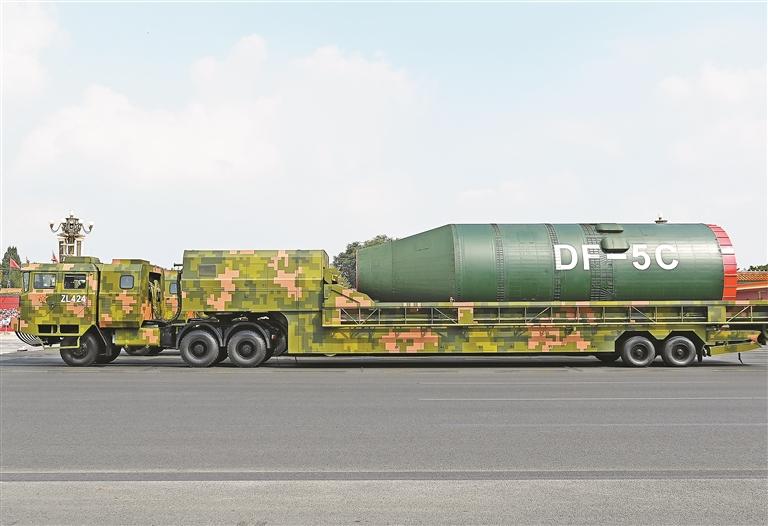 核导弹第二方队 12台大型导弹运输车载着“东风-5C”液体洲际战略核导弹浩荡而来。核导弹第二方队是装备方队压轴出场的方队。 “东风-5C”液体洲际战略核导弹是我国战略反击体系中的重要组成,打击范围覆盖全球,全时戒备、有效威慑,以武止戈、砥定乾坤。