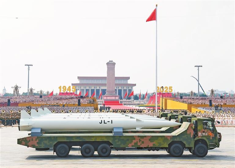 核导弹第一方队 受阅的“惊雷-1”空基远程导弹、“巨浪-3”潜射洲际导弹、“东风-61”陆基洲际导弹、“东风-31”新型陆基洲际导弹,首次集中展示我军陆、海、空基“三位一体”战略核力量。