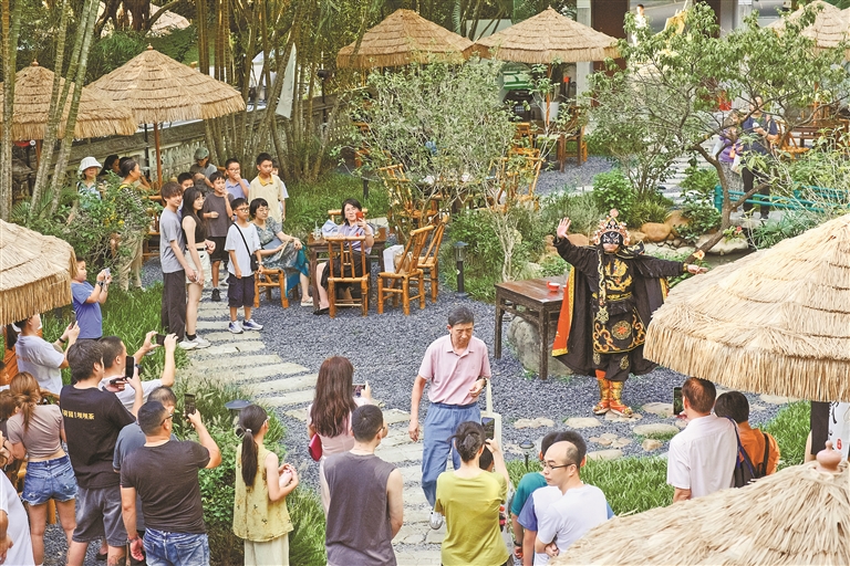 园博园新开张的茶馆薄荷园·坝坝茶接连两天举办了“茶韵川风·奇艺夜”活动,川剧变脸、长嘴壶茶艺非遗表演吸引了众多市民游客前来观看。“让人眼前一亮,木桌竹椅、小桥流水,坐下来很安逸。”在园博园游玩的李先生一家三口正好碰到表演,于是循声走进院子,他表示,这次来公园感觉变化挺大。