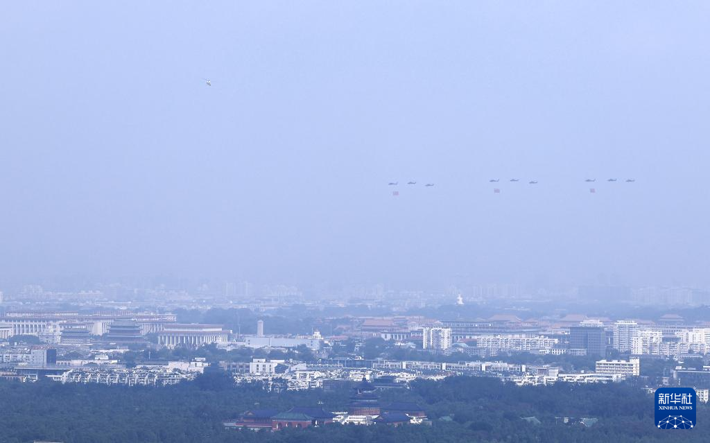 9月3日,纪念中国人民抗日战争暨世界反法西斯战争胜利80周年大会在北京隆重举行。这是空中护旗梯队。