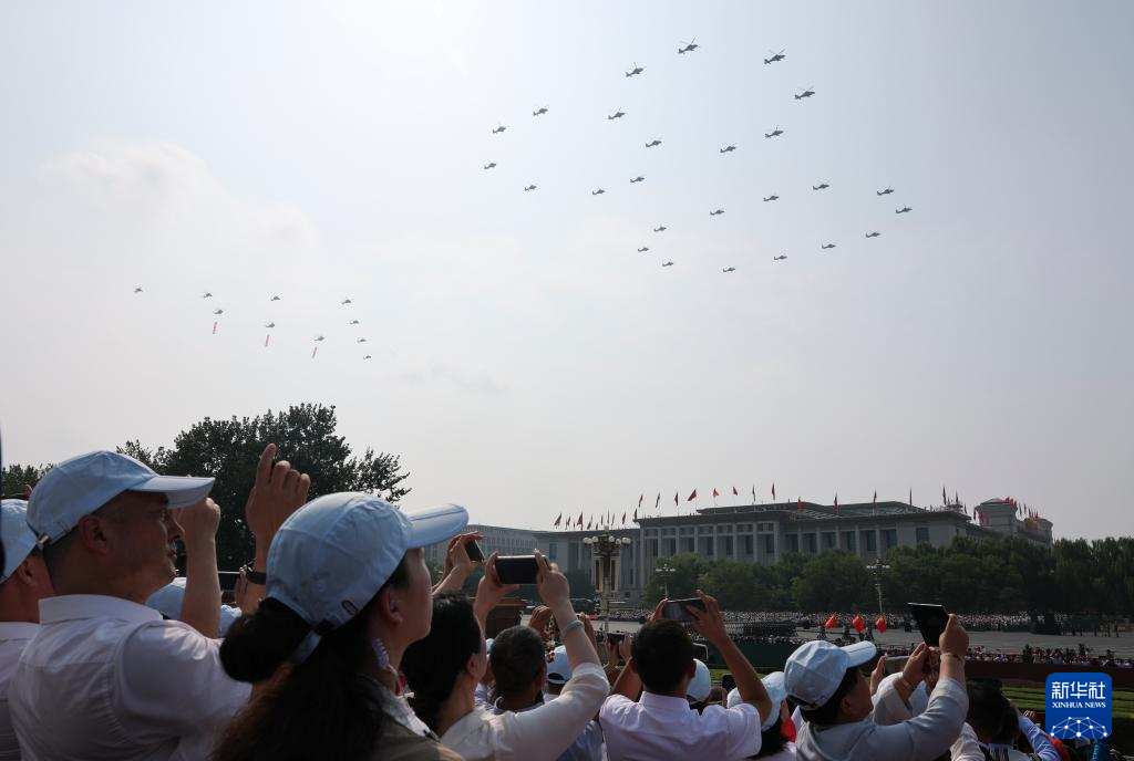 9月3日,纪念中国人民抗日战争暨世界反法西斯战争胜利80周年大会在北京隆重举行。这是空中护旗梯队飞过天安门广场上空,26架直升机汇成巨大的“80”字样。