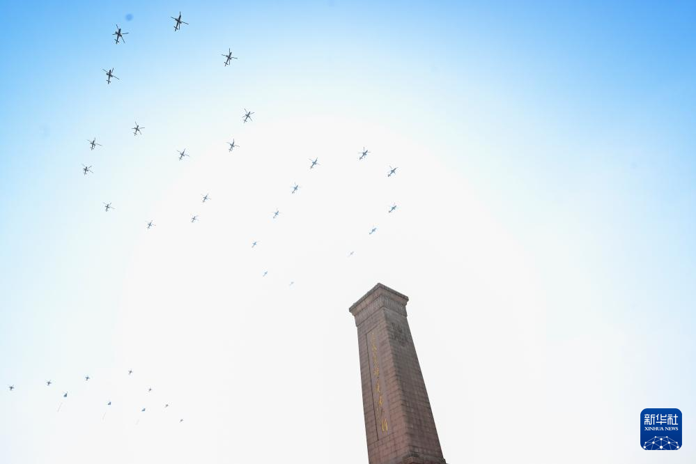 9月3日,纪念中国人民抗日战争暨世界反法西斯战争胜利80周年大会在北京隆重举行。这是空中护旗梯队通过天安门广场。