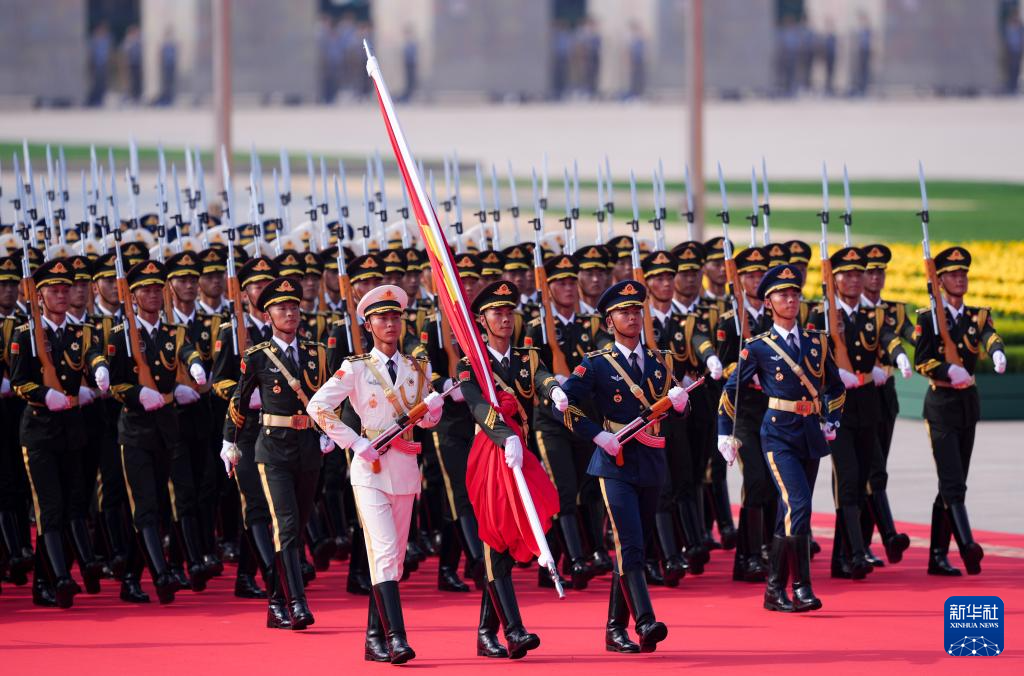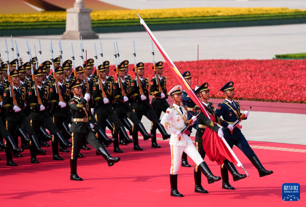 9月3日,纪念中国人民抗日战争暨世界反法西斯战争胜利80周年大会在北京隆重举行。这是国旗护卫队官兵护卫着五星红旗,从人民英雄纪念碑行进至广场北侧升旗区。
