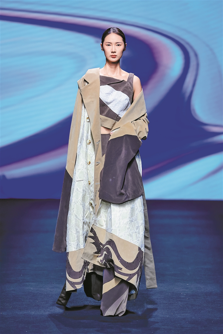 这些创作者的设计逻辑成熟完整,敏锐聚焦于玉兰、柳编、麦穗、皮影、窗格等中华优秀传统文化中“小而美”的具象元素,积极探索材质边界,从天然矿石、泥塑土坯等非传统领域汲取灵感,注重工艺研究与穿着体验,成功将跨界材料融入设计,实现创意与商业的无缝衔接。设计师们积极践行“零浪费”可持续理念,通过重塑废弃布料、二次创作编织袋、回收闲置衣物及快递纸箱等方式,研发新型面料,最大化实现废料活化与资源再利用,展现年轻一代对可持续时尚的担当。