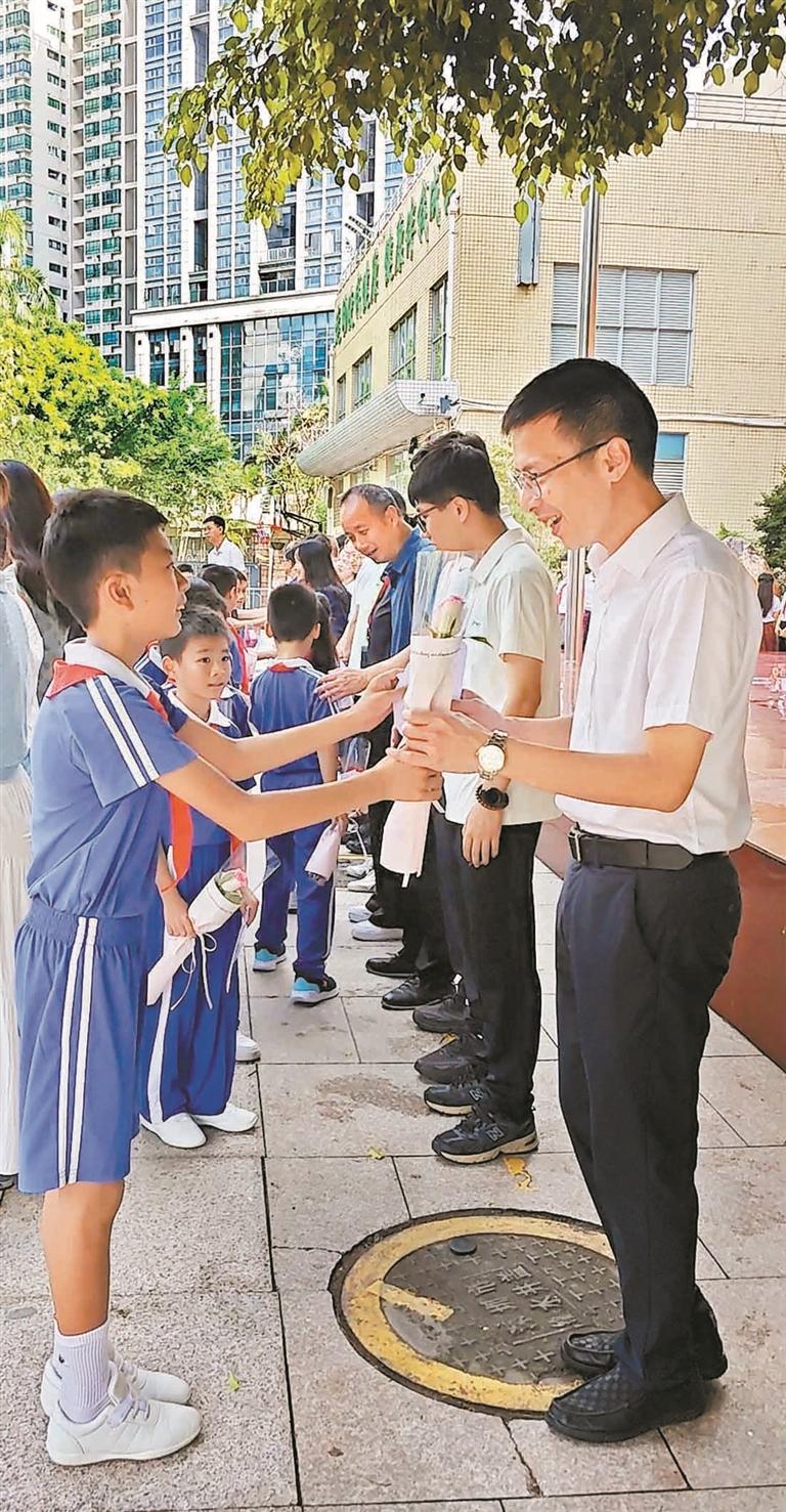 有的学校把心意融进了校园角落的布置中。9月9日,走进华侨城高级中学的校园入口处,“我的第N个教师节”打卡墙格外醒目。老师手持对应教龄的数字牌驻足拍照,用镜头定格从教岁月里的珍贵印记——教龄数字从1到43,每一个数字背后,都是一段与学生、与教育相关的独家故事。
