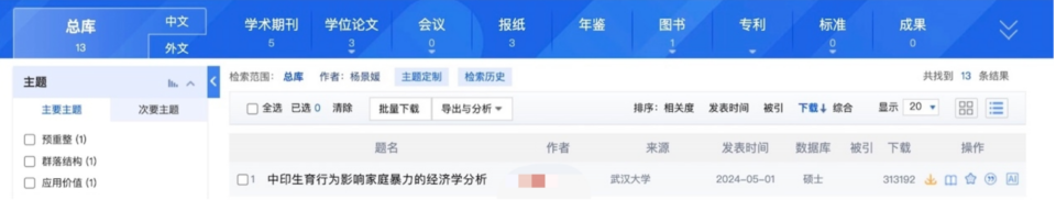 9月10日上午,记者查询中国知网发现,武汉大学杨某媛的论文《中印生育行为影响家庭暴力的经济学分析》已经下架。有网友截图显示,该论文下载量曾达31万次以上,在文献来源为“武汉大学”的论文中高居第一。杨某媛论文撤下后,目前下载量最高的武汉大学论文下载次数为8.4万次。