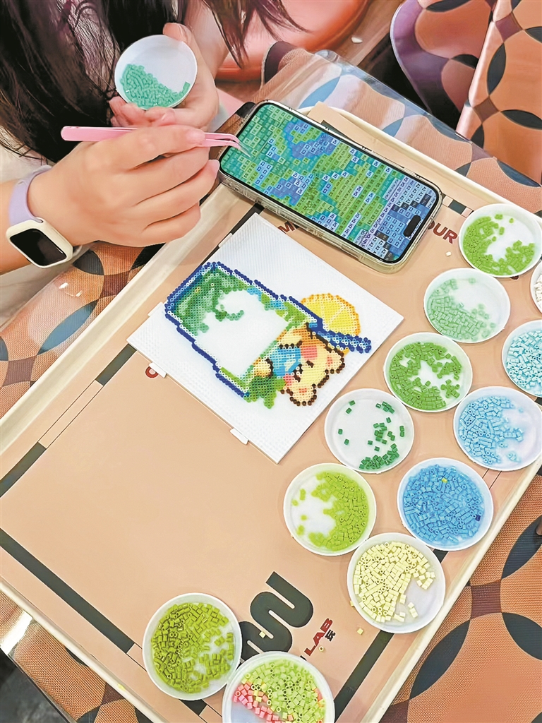 编织区仿佛拥有让人静心的力量,让人只专注手中纱线的走向;备受年轻人喜欢的拼豆,考究的是手部精细动作和耐心,一步步制作出独属于自己的作品。还有热缩片、奶油胶、香薰等项目可供体验,每一项手作,都有可能迸发出无限创意。