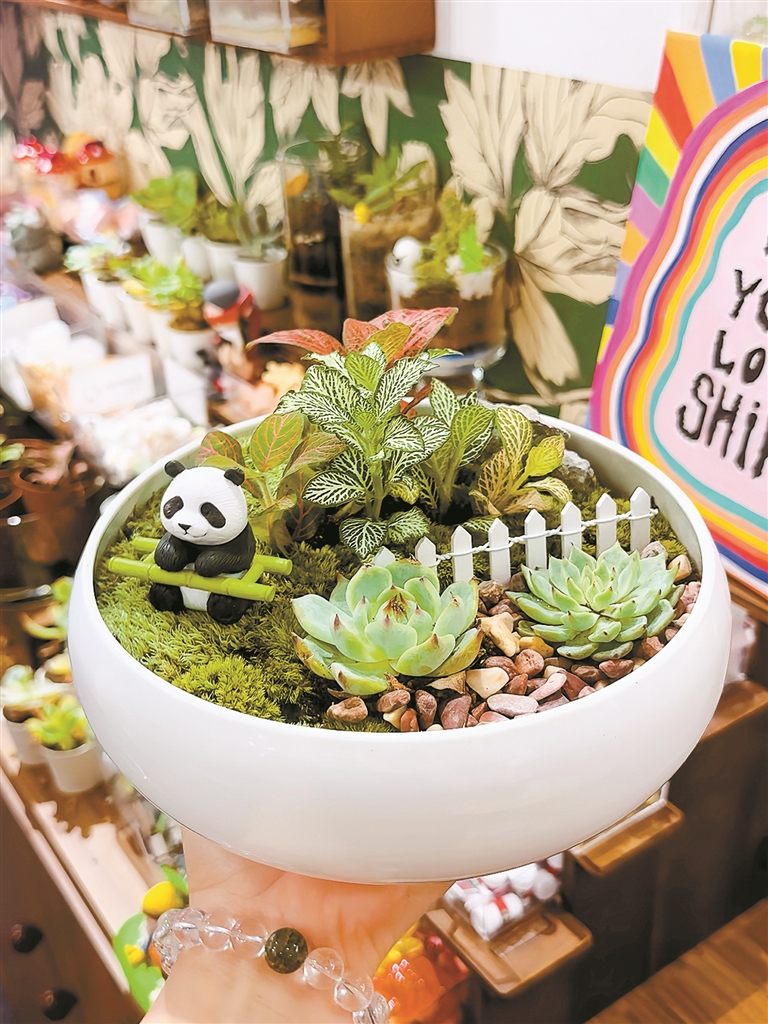 Lucy表示,通过将桌面微景观与潮玩结合的方式,让人们在动手制作微景观的时候,也能被各种可爱的玩具所吸引。“许多人或许因为忙没空出游,那么经营一个小小的桌面‘世界’,也是疗愈身心的不错选择。”不同的容器、不同的创意想法,营造出来的桌面微景观截然不同。“在微景观里添加潮玩的意义在于可以营造故事场景。”不同颜色的沙石与赤玉土混合,让色彩分层,铺上苔藓或者其他绿植,再配上自己喜欢的潮玩“小配件”,一个桌面微景观就大功告成了。“有些人会为自己喜欢的玩偶造一个花园或者森林,特别有意思。”Lucy说,许多人通过制作桌面微景观,会产生一种虽然身在城市,但通过一次手作,像旅游了一趟。“它可变性很强,随时可以更换场景。”
