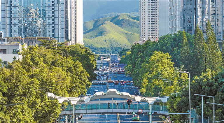近日,在深圳上步路远眺香港鸡公岭,车水马龙配上绿野风光的独特景色,在网上迅速走红,吸引了不少摄影爱好者前来解锁这一美景。