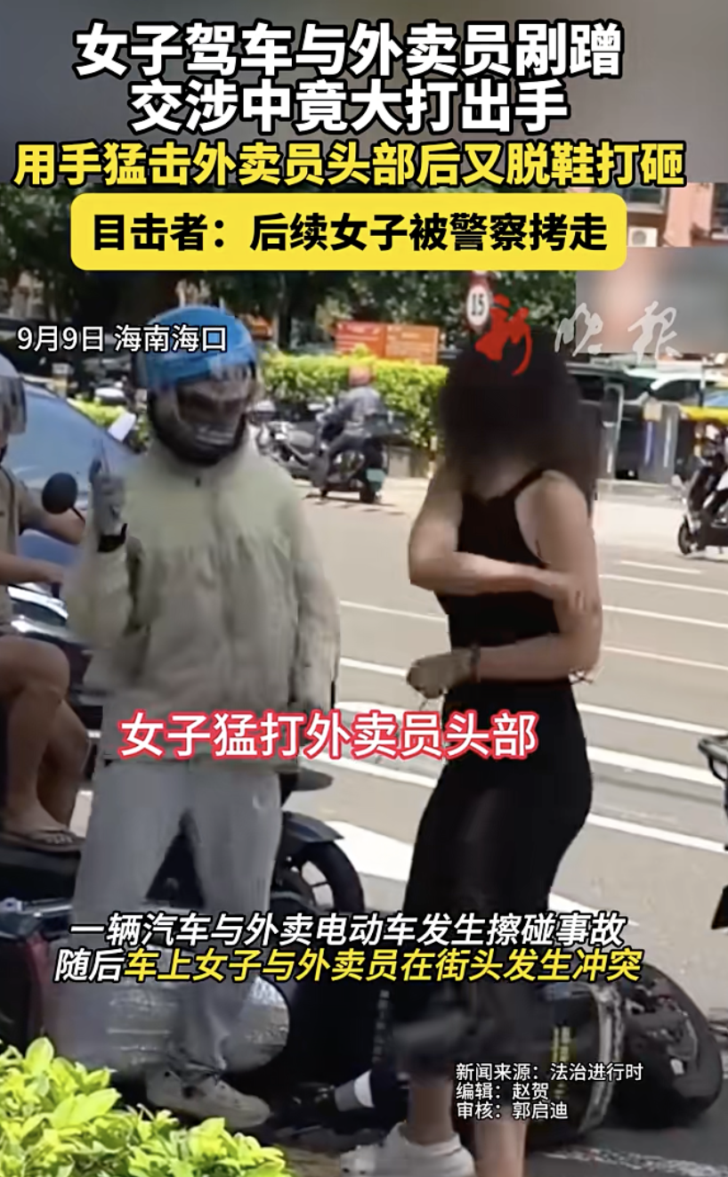 据南国早报报道,9月9日,海南海口,一轿车与外卖员发生擦碰事故,随后女司机与外卖小哥在街头大打出手。有目击者称,女司机一只脚穿高跟鞋,另一只脚穿平底鞋,最终被警方带走了。