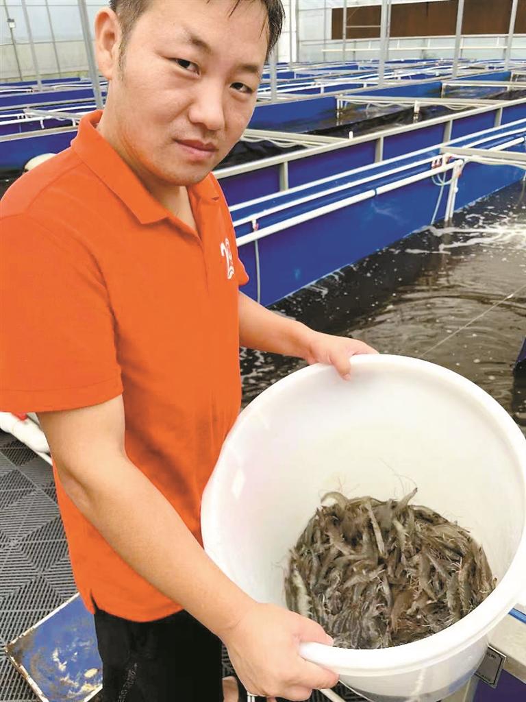 随后,工作人员和记者来到用微藻养虾的大棚内,无数虾苗在循环水池中起浮游动。“这里养殖的对虾对淡盐水浓度有非常高的要求。在放入虾苗之前,工作人员必须对淡盐水进行特殊处理。”工作人员告诉记者,从虾苗到成年一般需要3个月,平均每只约20克。