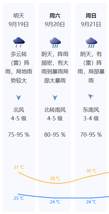 19日:受台风外围环流影响,多云转(雷)阵雨,局地雨势较大,风力逐渐加大至7-8级,高温天气缓解。