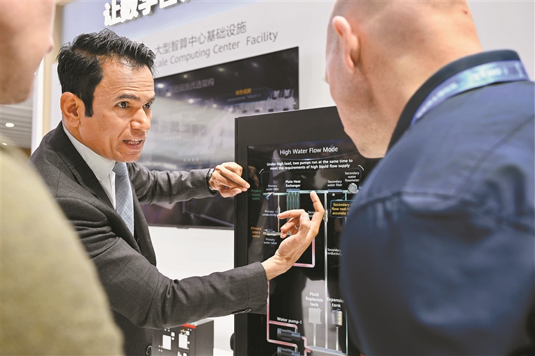 在华为展位,工作人员正在向外国友人细致讲解设备相关技术原理。深圳特区报记者 胡蕾 摄