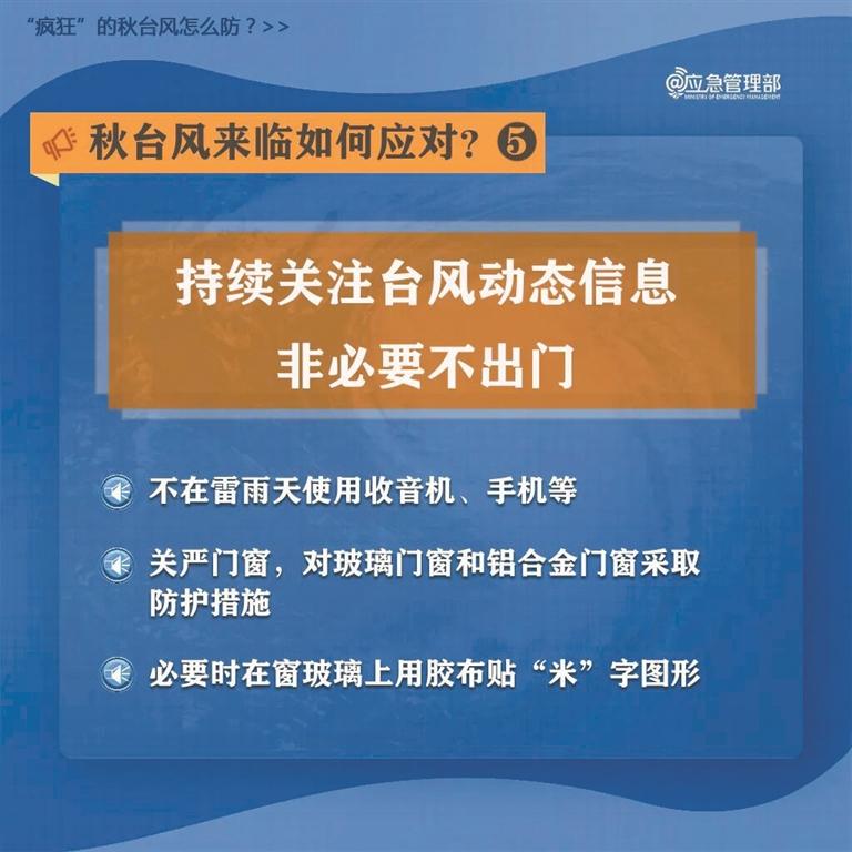 检查并加固门窗,用胶带在玻璃上贴成“米”字形,特别是沿海高层住户需重点做好此项工作。市区里面朝东和朝南的窗户也得重点防范,及时收回阳台花盆、晾衣架等所有高空悬挂物,防止坠落伤人。