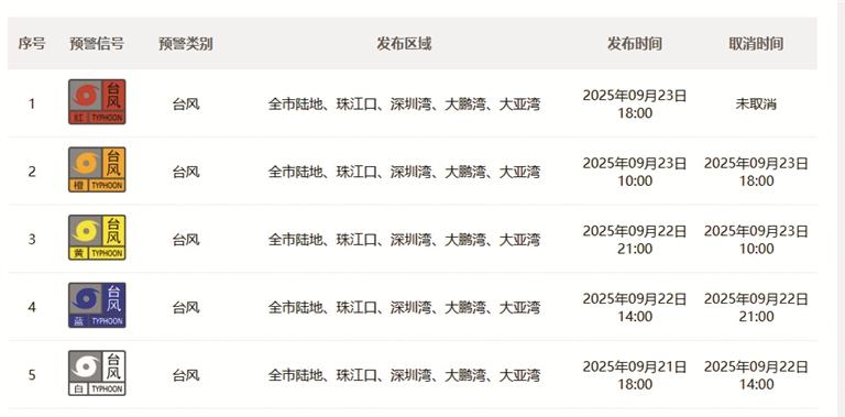 9月22日至23日深圳市气象台将全市台风预警信号从白色逐级升为红色。
