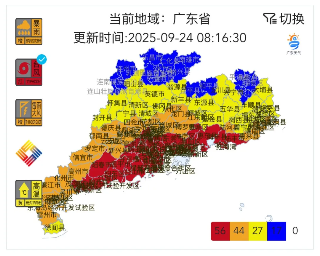 截至24日8时16分,广东有56个台风红色预警、44个台风橙色预警、27个台风黄色预警、17个台风蓝色预警信号生效。