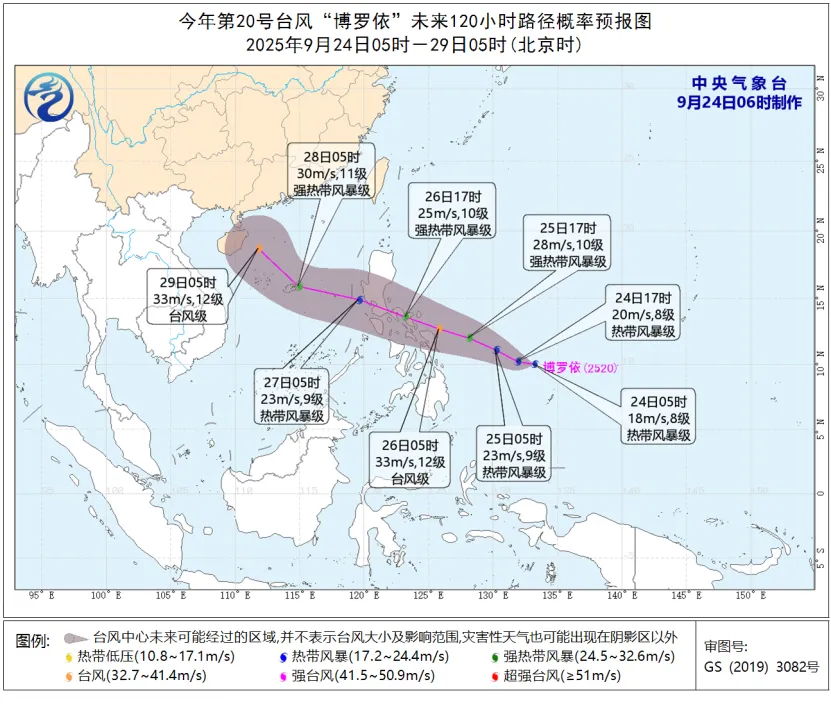 预计,“博罗依”将以每小时10-15公里的速度向偏西方向移动,逐渐向菲律宾东部沿海靠近,于27日进入南海东部海域,之后向西北方向移动,强度有所增强。