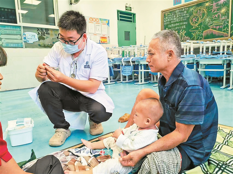 驻点在新智学校的社康医生蒋剑钰和护士石凤立即携带急救药箱赶到孩子家人所在的临时安置区域。在仔细询问病史、进行体格检查后,蒋剑钰在熟练处理的同时,用温和而专业的语言向家长解释孩子的状况和处理方案。用药后,医生并未离开,而是持续观察孩子的反应。