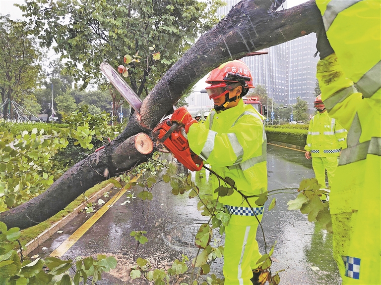 龙华新闻讯(记者 蔡维泽 通讯员 田传宁 许志安 文/图)9月24日,受超强台风“桦加沙”影响,龙华区暴雨倾盆、狂风肆虐,辖区出现树木倒伏、护栏崩塌、道路受堵、车辆被砸等情况。危急时刻,龙华区消防救援大队闻风而动、冒雨奋战,全力开展清障行动,排除安全隐患,保护城市安全。