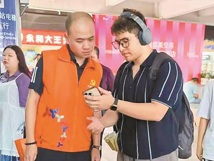 当地方言与异国语言在车站交汇,熟练掌握多种语言的“多语通”志愿者们便成为了打破隔阂的桥梁。他们用流利的英语协助外籍旅客购票,用亲切的粤语为长者解疑释惑,更灵活运用翻译软件与手势,为迷茫的异乡人精准指引方向。从成功帮助只会讲方言的老人联系上家属,到帮助外宾完成外币兑换,每一次耐心的沟通都化解了因语言不通而产生的焦虑。