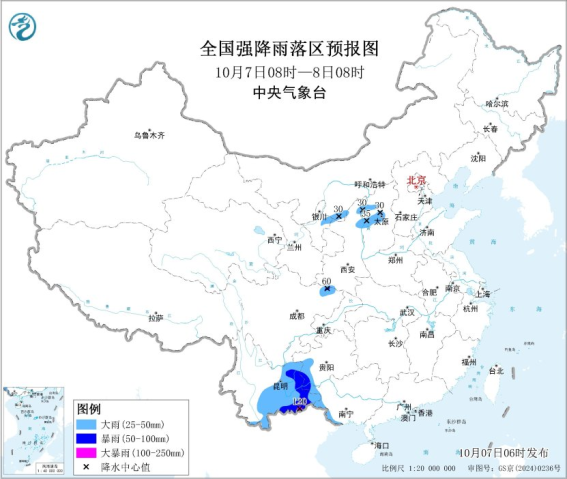 中央气象台今晨发布暴雨蓝色预警:预计今天,贵州西部、云南东部和南部、广西西南部等地部分地区有大到暴雨,云南东南部等地部分地区有大暴雨(100~120毫米)。上述部分地区伴有短时强降水,最大小时降雨量20~40毫米,局地可超过50毫米。